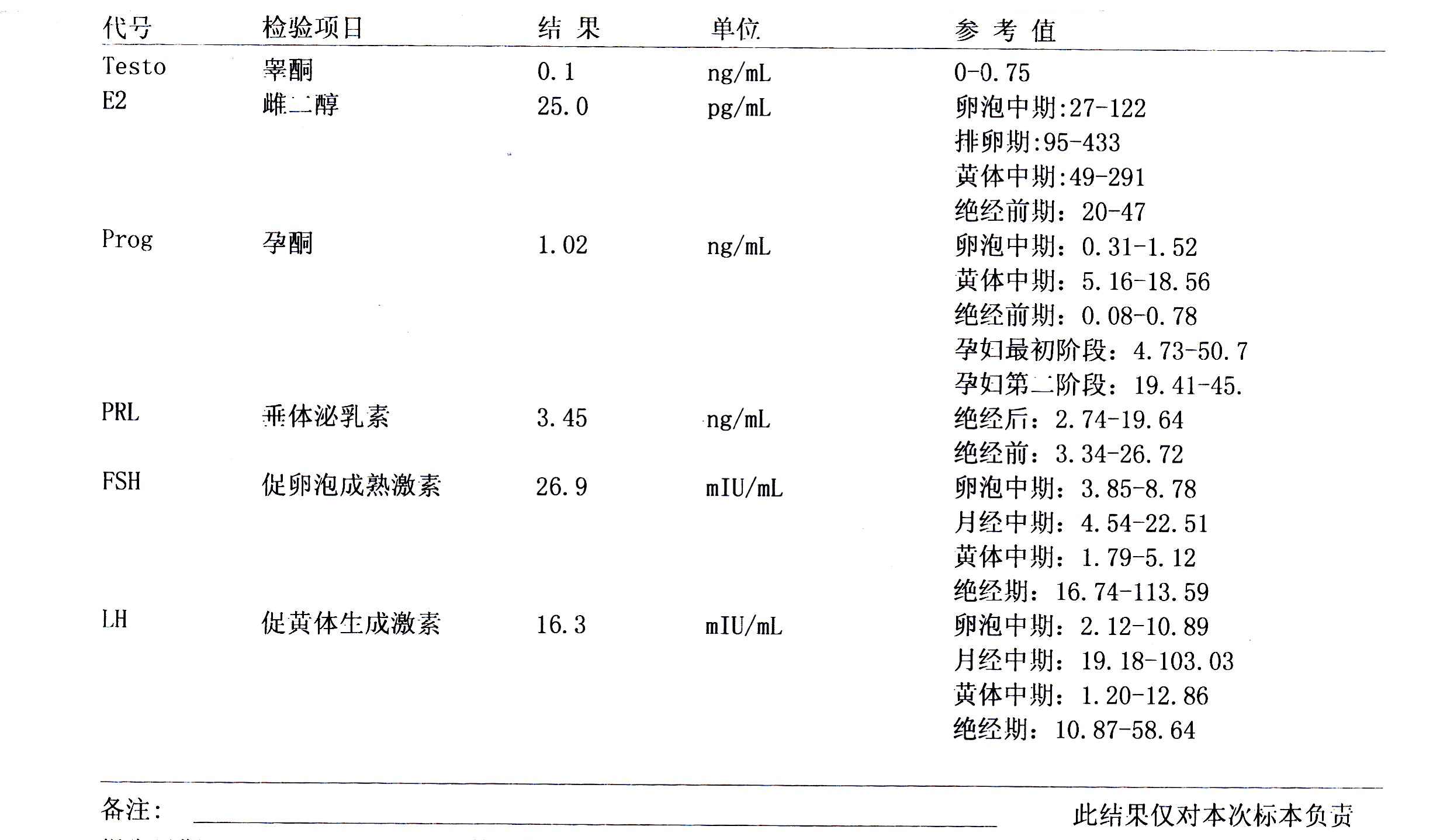 经过一系列详细的检查后,由于我工作和生活的原因,我未能在北京等待所有的检查结果。但在我离开前,我得知了部分关键数据:FSH26.9,LH16.3。这两个数值的异常被医生特别标注,并为我开具了克龄蒙这种药物。